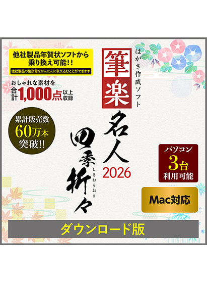 ■カンタン操作でらくらく作成。累計販売60万本突破!シンプルな操作で年賀状や日々の挨拶状を簡単に作成できるパソコンソフトです。おかげさまで累計販売本数60万本を突破。筆楽名人2026では干支など年賀状用はもちろん挨拶状やグリーティングカードの作成に使える季節のアイコンや素材を多数収録!年間を通してご利用いただけます。■年賀状はもちろん、普段のちょっとした挨拶状もかんたんに作成写真にイラストを添えて、ご両親やご友人にちょっとした感動をおすそ分け。年賀状だけでなくグリーティングカードや暑中見舞い等もカンタンに作成できます。例)・お子さんの晴れ姿・近況・旅行や日々でのきれいな風景・趣味で作ったものや釣った魚などサクサク使いやすい筆楽名人なら写真+画像素材を使ってカンタンに写真のデコレーションも可能です。気軽に思い出の写真を加工・作成ができます。■作成したデザインは画像で保存して使用可能。作成したデザインは画像として保存・使用できます。はがきに印刷するだけでなく、小さいサイズで保存した画像をメールやSNSに添付して気軽にご家族やご友人に送ることも可能です。■高画質素材を1000点以上収録!・収録されている素材は全て高画質。ハガキを綺麗に印刷できます・干支や年号など年賀用素材を多数収録、配置やサイズ調整も自由自在・年賀用素材だけでなく、四季折々のイベントや季節のイメージ素材もご用意・そのまま使えるテンプレートならデザインせずにすぐに年賀状・挨拶状が完成します。■他のソフトからの移行も楽々。住所録をかんたんに取り込み!住所録はcsv形式で一括登録もできます。筆ぐるめ、筆王、筆まめ、はがき作家、宛名職人など、主要なソフトで作成した住所録データもCSVで出力すれば、簡単に取り込みが出来ます。住所録をプリントして見やすい形で住所録を管理・保管することもできます。■筆楽名人なら3台まで利用可能!ソフトは3台のPCまで利用できるため、ご利用環境にあわせた使い方・インストールが可能です。(C)2025 Rio Co.,Ltd